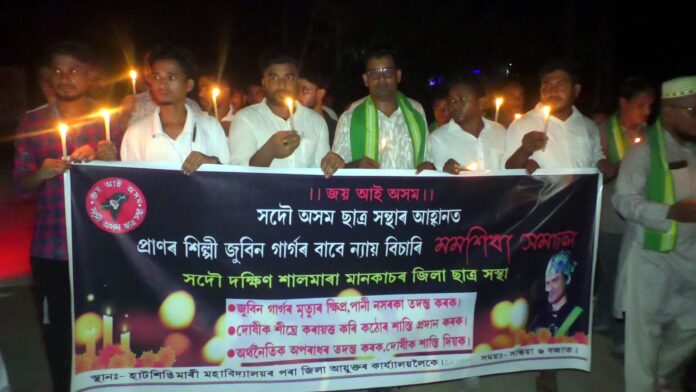 সদৌ অসম ছাত্র সন্থাৰ আহ্বানত সদৌ দক্ষিণ শালমাৰা-মানকাচৰ জিলা ছাত্র সন্থাই শুক্ৰবাৰে সন্ধিয়া ৬ বজাত গৰীয়া-মৰীয়া দেশী জাতীয় পৰিষদ আৰু ৰাইজৰ সহযোগত প্ৰাণৰ শিল্পী জুবিন গাৰ্গৰ বাবে ন্যায় বিচাৰি মমশিখা সমদল কাৰ্যসূচী ৰূপায়ন কৰে। হাটশিঙিমাৰী মহাবিদ্যালয় চৌহদৰ পৰা উলিওৱা এই মমশিখা সমদলত অংশগ্ৰহন কৰা প্ৰতিবাদকাৰী সকলে হাতে হাতে মমবাতি লৈ জিলা আয়ুক্তৰ কাৰ্যালয়ৰ সম্মুখত সমবেত হৈ বিভিন্ন শ্লোগান দিয়ে। জুবিন দা অমৰ হওক, জয় জুবিনদা, জুবিনদাক ন্যায় লাগে বুলি আছু কৰ্মী সকলে হাটশঙিমাৰী জিলা আয়ুক্তৰ কাৰ্যালয়ৰ সম্মুখত উত্তাল শ্লোগান দিয়ে। এই মমশিখা সমদল কাৰ্যসূচীৰ জৰিয়তে আছুয়ে কেবাটাও দাবী উত্থাপন কৰিছে। দাবী কেইটা ক্ৰমে- জুবিন গাৰ্গৰ মৃত্যুৰ ক্ষিপ্ৰ, পানী নসৰকা তদন্ত কৰক, দোষীক শীঘ্ৰে কৰায়ত্ব কৰি কঠোৰ শাস্তি প্ৰদান কৰক, অৰ্থনৈতিক অপৰাধৰ তদন্ত কৰক আৰু দোষীক শাস্তি দিয়ক । বিজেপি চৰকাৰে শীঘ্ৰে অভিযুক্ত কেইজনক গ্ৰেপ্তাৰ নকৰিলে আছুয়ে পৰৱৰ্তী পৰ্যায়ত ৰাইজৰ সহযোগত ভয়ংকৰ আন্দোলনৰ কাৰ্যসূচী হাতত লোৱাৰ হুংকাৰ প্ৰদান কৰে জিলা আছুৰ সভাপতি আব্দুৰ ৰেজ্জাক সেখ।