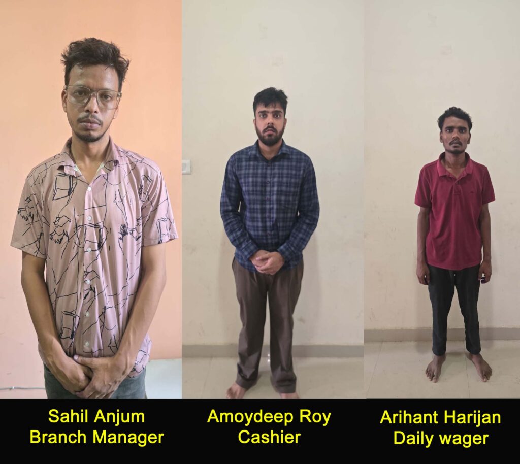 ধৃত বেংক কৰ্মচাৰী কেইজন ক্ৰমে, কামৰূপ মেট্ৰ জিলাৰ দিছপুৰ থানা এলেকাৰ অধীনস্থ ছিক্সমাইল এফ এ আহমেদ নগৰৰ ১১ নং বাইলেনৰ ৫৪ নং হাউজৰ বাসিন্ধা ৰেজাউল কৰিমৰ পুত্ৰ শ্বাহিল আঞ্জুম (৩৫), শ্ৰীভূমি জিলাৰ পাথৰকান্দি থানা এলেকাৰ অধীনস্থ সোনাখিৰা গাঁৱৰ অজয় ৰয়ৰ পুত্ৰ অময়দ্বীপ ৰয় (২৬) আৰু দক্ষিণ শালমাৰা-মানকাচৰ জিলাৰ মানকাচৰ থানা এলেকাৰ অধীনস্থ কাশাৰীপাৰা গাঁৱৰ শ্ৰী সুৰেশ কুমাৰ হৰিজনৰ পুত্ৰ আৰিহাণ্ট হৰিজন (২৯) বুলি সম্পূৰ্ণ পৰিচয় লাভ কৰিব পৰা গৈছে।